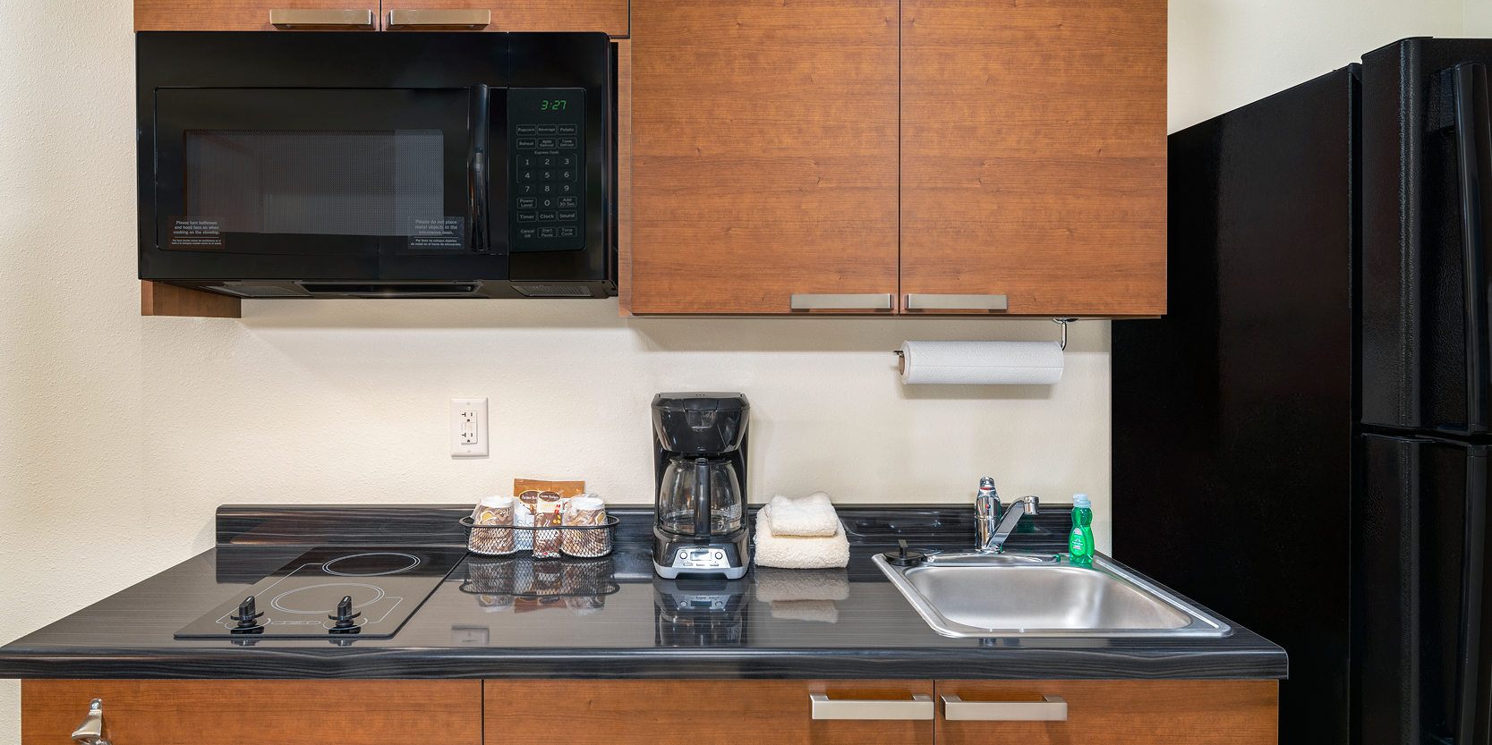 All rooms feature pillow top mattresses, microfiber bedding, and a variety of soft and firm pillows. For added convenience, all rooms have a “My Kitchen,” which includes a full-sized refrigerator, a two-burner cook top, coffee maker and a microwave. As our guest you will enjoy premium cable channels on a flat-screen TV, as well as free Wi-Fi and wired internet access. Guests can choose from a variety of options from our Breakfast in Bed program for a delivered breakfast option. Outside the guest room the hotel offers on-site laundry facilities, a business center with computer, a fully stocked My Store with a variety of food and beverage options, and a twenty-four-hour coffee station.
