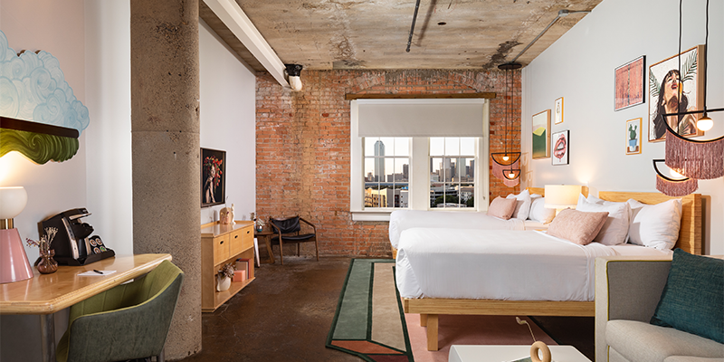 Reimagined by boutique design firm, Studio11 Design, our pet-friendly hotel in South Dallas occupies a renovated brick building that is nearly a century old. Industrial elements blend seamlessly into art-filled, urban chic spaces. Smartly appointed guest rooms are outfitted in an eclectic mix of retro furnishings, hand-selected fixtures, custom design details, and tons of local artwork.