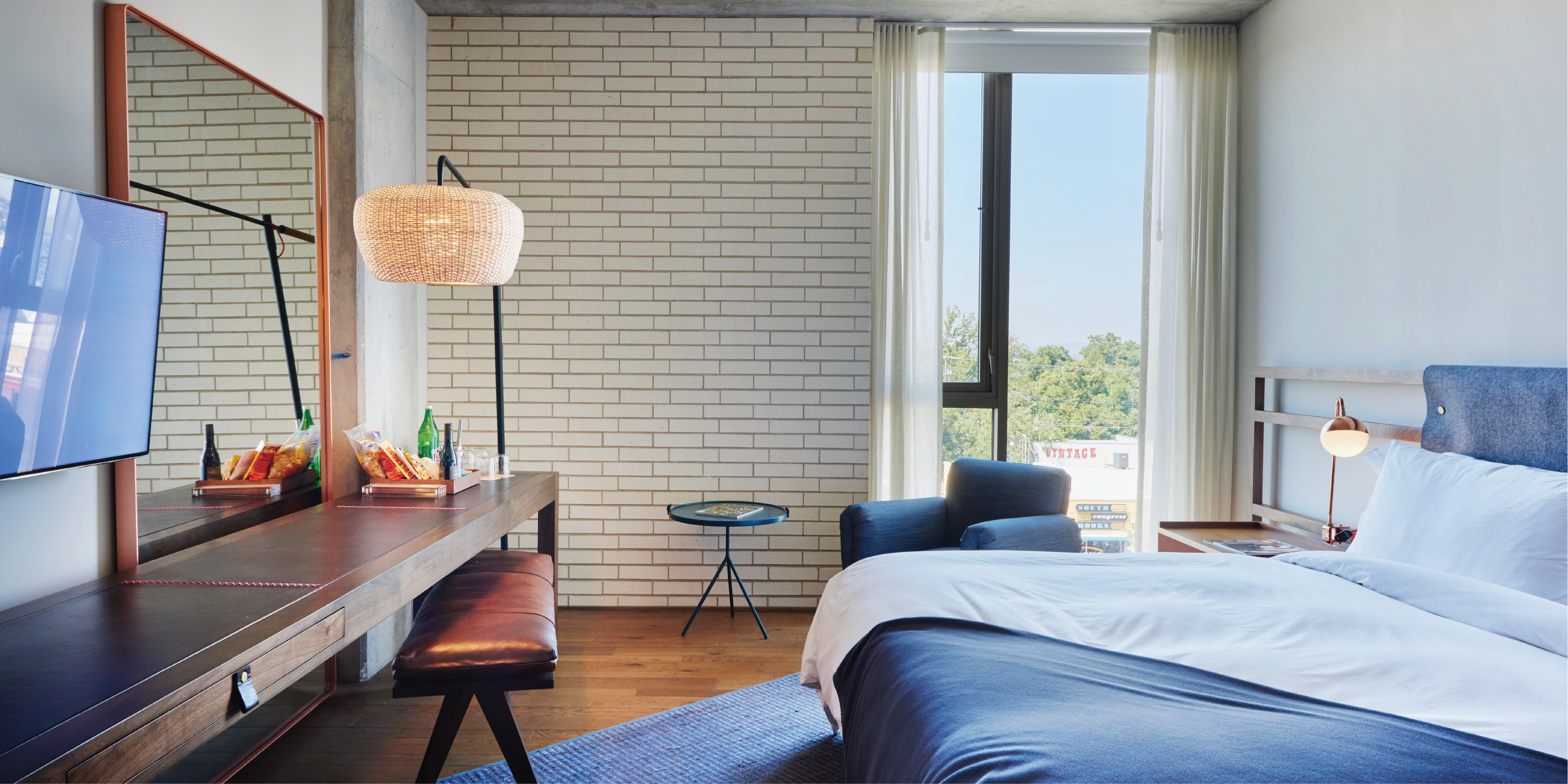 GUESTROOMS Featuring hardwood floors, custom-designed furniture, bespoke Matteo bedding, complimentary Wi-Fi, a 46” LED TV, a Bluetooth radio, large walk-in shower stocked with Ursa Major hair and body products, and an art program featuring photography and prints by Austin-based artists.