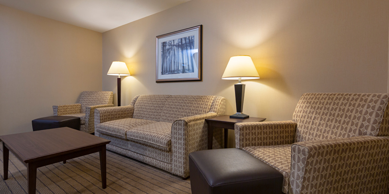 Skiing with the family, fishing with the guys or enjoying a ladies’ weekend away? Our spacious Family Suite offers 2 queen beds in the main living area, and a separate bedroom with a king bed and flat-panel TVs in both areas. The bathroom boasts granite counter-tops, a rainfall shower head, and eco-friendly fixtures.