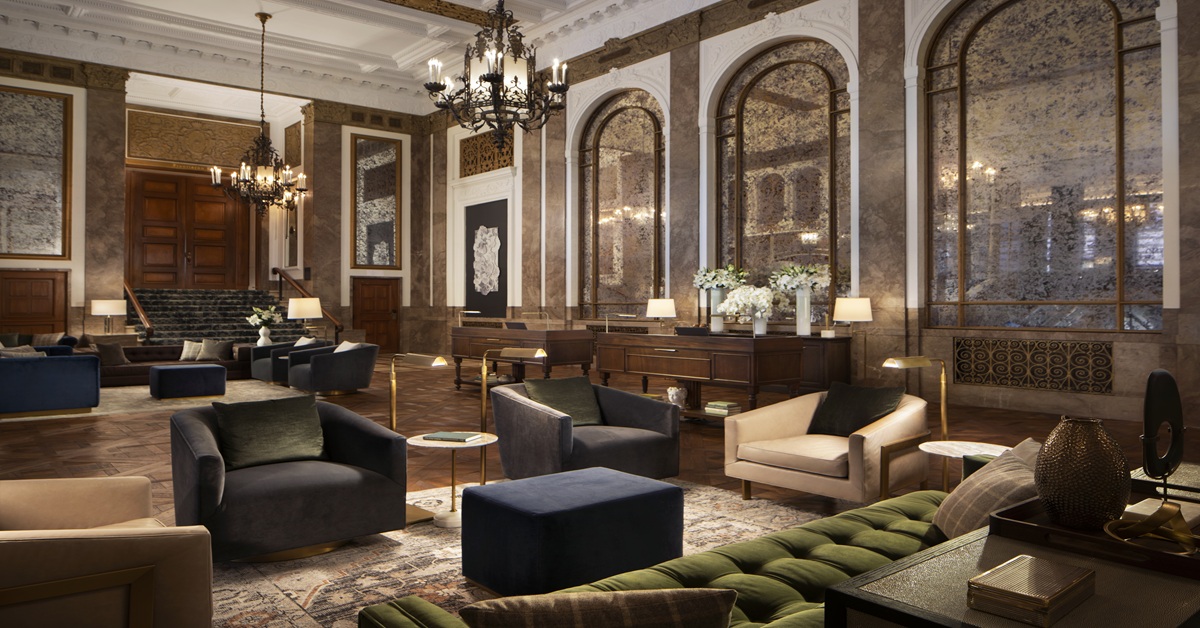 The transformation preserved the grand staircase, ornate ceilings, and glamorous bones you’d expect from a 1920s hotel, while elevating everything guests actually touch: lighting, textiles, furnishings, tech, and comfort.