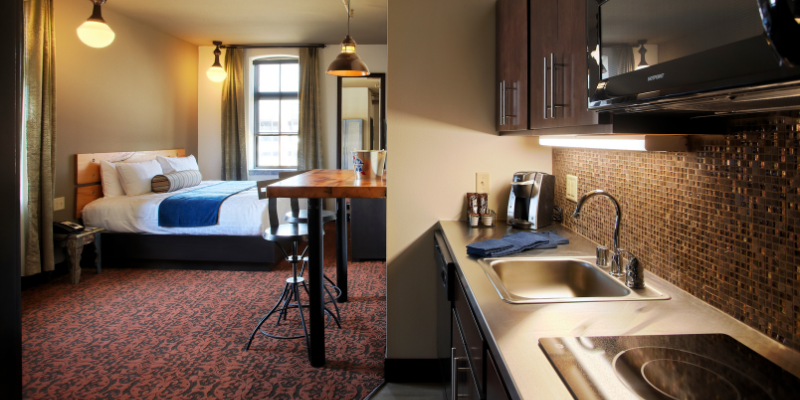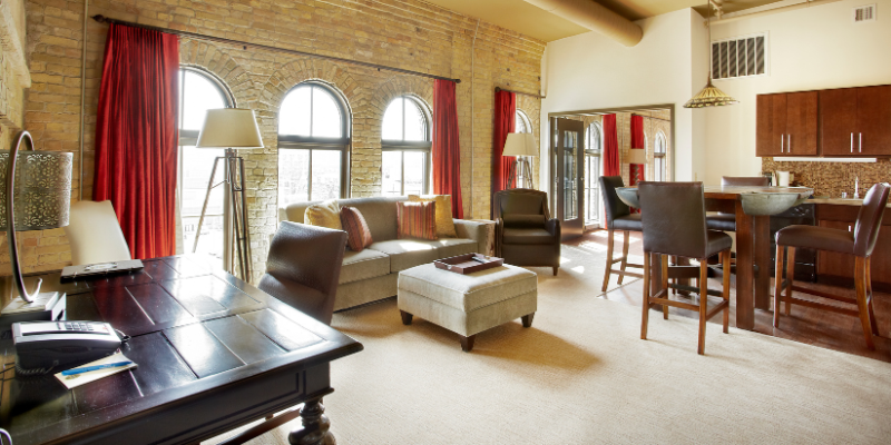 Immerse yourself in the distinctive charm of our 90 spacious suites, blending industrial-chic style décor with comfortable amenities. Each suite boasts a full kitchenette, soaring ceilings, large steel beams, exposed cream city brick walls, and expansive windows, providing an unparalleled atmosphere you won’t find elsewhere.