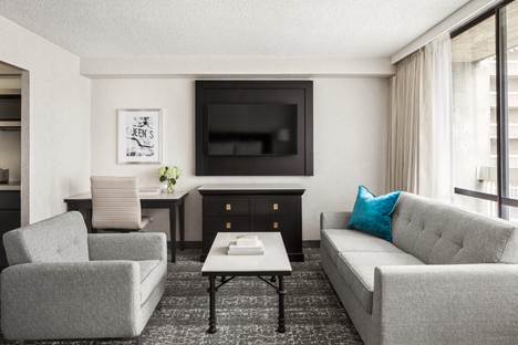 For an elevated stay, the Executive rooms provide a sleek, calming atmosphere with natural lights, and upgraded amenities such as a 50” flat-screen TV, blackout drapes, Nespresso machine, mini-fridge, blackout drapes, and balcony access.