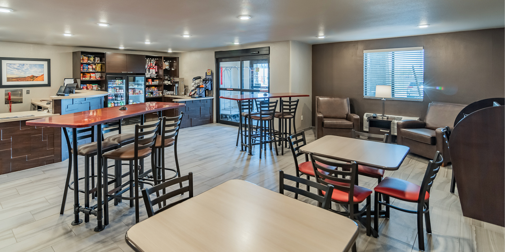 All rooms feature pillow top mattresses, microfiber bedding, and a variety of soft and firm pillows. For added convenience, all rooms have a “My Kitchen,” which includes a full-sized refrigerator, a two-burner cook top, coffee maker and a microwave. As our guest you will enjoy premium cable channels on a flat-screen TV, as well as free Wi-Fi and wired internet access. Guests can choose from a variety of options from our Breakfast in Bed program for a delivered breakfast option. Outside the guest room the hotel offers on-site laundry facilities, a business center with computer, a fully stocked My Store with a variety of food and beverage options, and a twenty-four-hour coffee station.