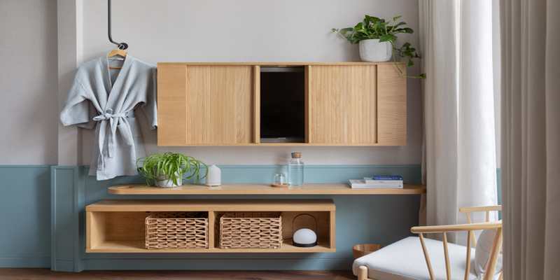 Bedrooms priorities sleep with calming hues and a contemplative feel that artfully fuses Scandi, British and Eastern elements. Peaceful communal areas include a noise free library, stocked with inspiring reads, and subterranean wellness center, Inhale at Inhabit, offering Gaia treatments. Guests can enjoy daily yoga, Pilates or guided meditation, and take advantage of the wood-paneled gym, which has a Peloton bike for live or virtual workouts.