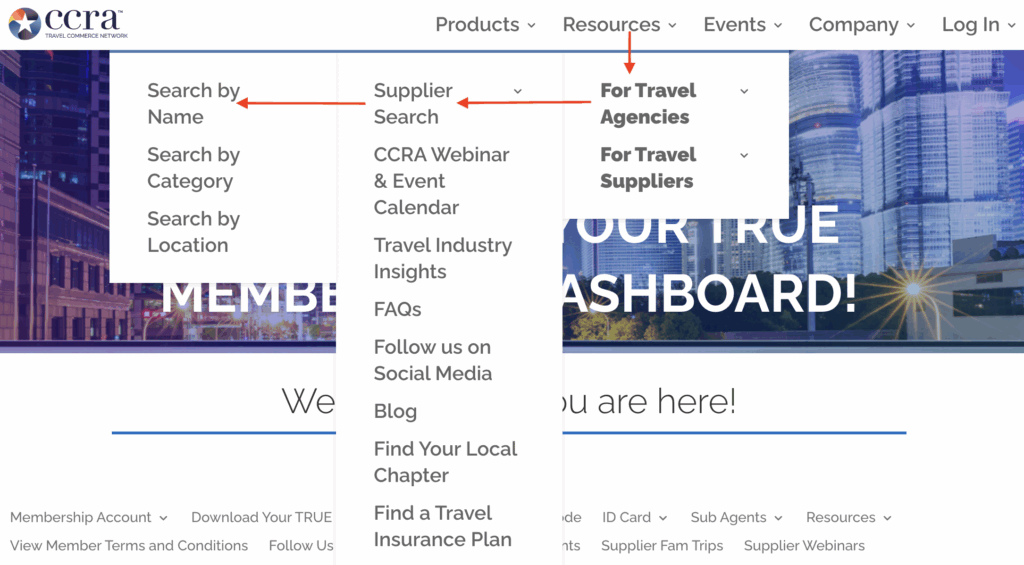 Login to your dashboard under Resources, For Travel Agencies, select Supplier Search and you will find multiple ways to search the Supplier Directory to begin your registration process.
