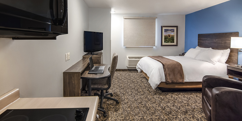 All rooms feature microfiber bedding and a variety of soft and firm pillows atop our exclusive My Place Plush pillowtop mattresses! For added convenience, all rooms have a “My Kitchen,” which includes a full-sized refrigerator, a two-burner cook top, coffee maker and microwave. As our guest, you will enjoy premium cable channels on a flat-screen TV, as well as free Wi-Fi and wired internet access. Guests can choose from a variety of options from our Breakfast in Bed program for a delivered breakfast option. Outside the guest room, the hotel offers 24-hour on-site laundry facilities, a business center with computer, a fully stocked My Store with a variety of food and beverage options, and 24-hour complimentary coffee.