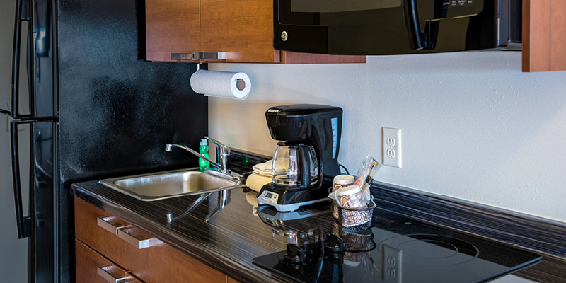 Rooms feature pillow top mattresses, microfiber bedding, and a variety of soft and firm pillows. For added convenience, all rooms have a “My Kitchen,” which includes a full-sized refrigerator, a two-burner cook top, and a microwave. Guests can choose from a variety of options from our Breakfast in Bed program for a delivered breakfast option. Outside the guest room the hotel offers on-site laundry facilities, a fully stocked My Store, and a twenty-four-hour coffee station.