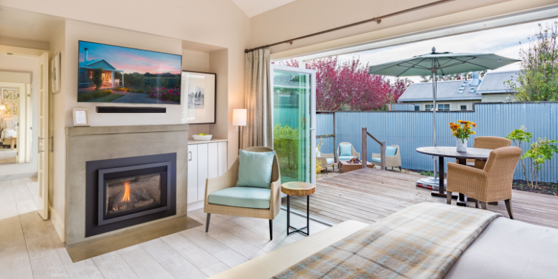 Carneros Resort and Spa’s private freestanding cottages are a haven of airy farmhouse comfort, blending the indoors with the charm of the countryside. Ranging from 400 square feet of living space and up to 800 square feet of outdoor living space, the individual cottages feature a neutral color palette and are equipped with various luxury amenities, including fireplaces, indoor-outdoor showers, outdoor fire pits and deep soaking tubs. Floor to ceiling glass bi-fold doors open onto a private deck creating a seamless indoor-outdoor living area that doubles the size of each room.