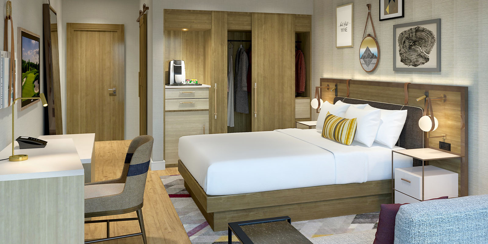 The hotel’s “Modern Agrarian” design is inspired by the beauty of the surrounding area. When your travelers arrive, they’ll step into a stylish two-story lobby and discover hotel amenities like an outdoor hot tub, barista bar, and a grab-and-go marketplace offering snacks and drinks. There’s also a full-service bar and restaurant that feature specialty wines and local craft beers on tap. Guest rooms are outfitted with sleek décor, modern artwork and spa-inspired bathrooms with Bluetooth mirrors that are perfect for streaming music or podcasts.