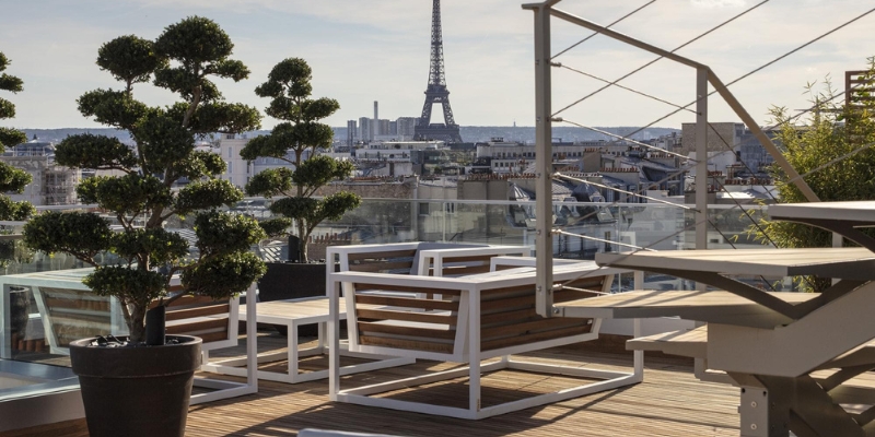 This exclusive penthouse, located on the top floor of the hotel, offers panoramic views of Paris’ gorgeous skyline, including landmarks such as the Eiffel Tower, Montmartre Sacré Coeur, the Tour Montparnasse and so much more.