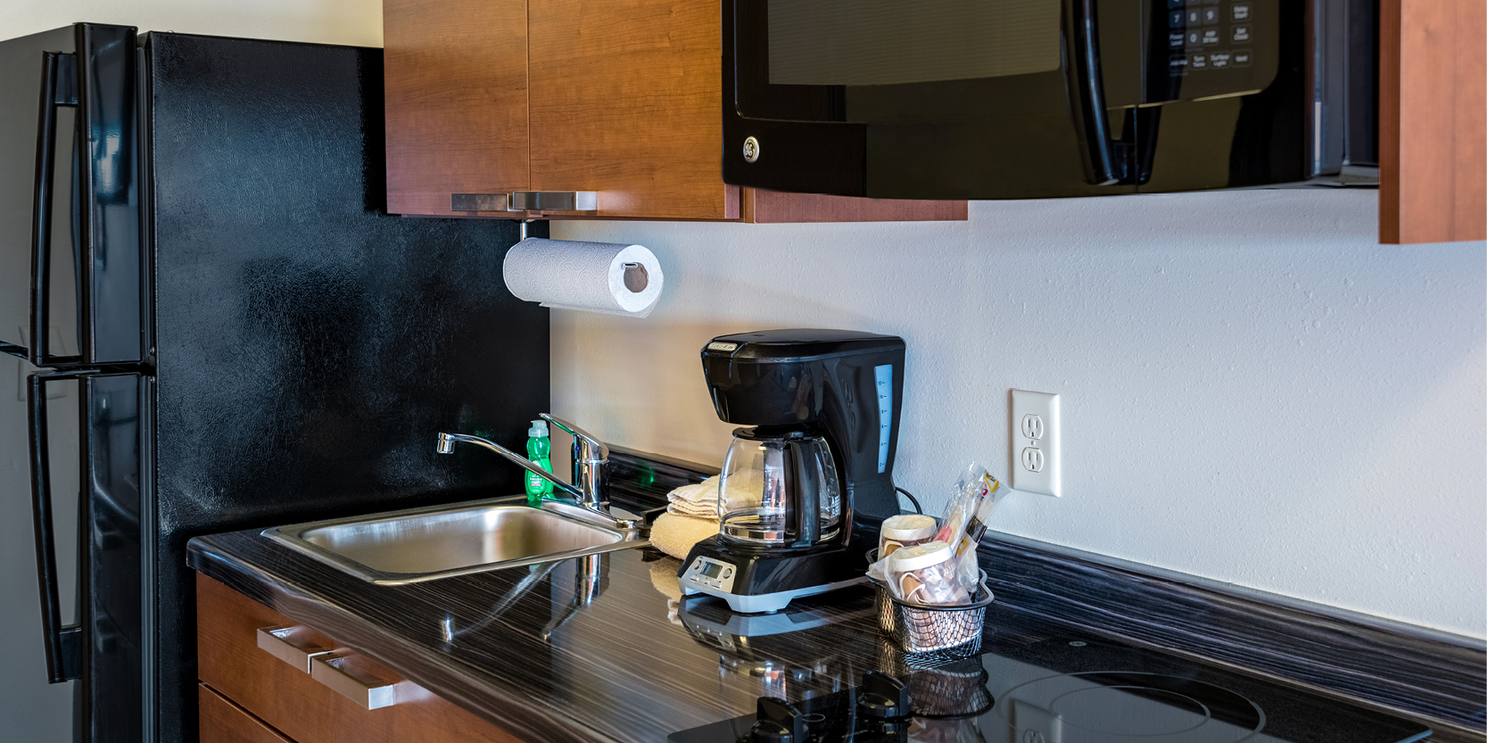 All rooms feature pillow top mattresses, microfiber bedding, and a variety of soft and firm pillows. For added convenience, all rooms have a “My Kitchen,” which includes a full-sized refrigerator, a two-burner cook top, coffee maker and a microwave. As our guest you will enjoy premium cable channels on a flat-screen TV, as well as free Wi-Fi and wired internet access. Guests can choose from a variety of options from our Breakfast in Bed program for a delivered breakfast option. Outside the guest room the hotel offers on-site laundry facilities, a business center with computer, a fully stocked My Store with a variety of food and beverage options, and a twenty-four-hour coffee station.