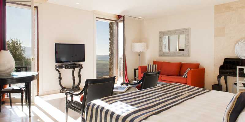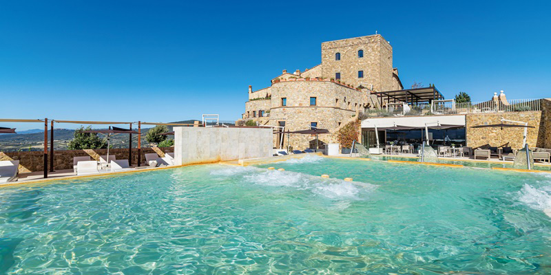The Castello di Velona Resort, Thermal SPA & Winery, located on a hill overlooking the Val d’Orcia, a UNESCO World Heritage Site, is a restored castle dating back to the 11th century. Located 1 h45 min. from Florence and just 8 km from Montalcino, dominates the Val D’Orcia, with its typical landscape of olive trees and vineyards, which produce the famous Brunello di Montalcino. The Castle has a total of 10 rooms and 35 suites designed according to two different concepts: Castle Rooms style (mainly with windows) and Contemporary Rooms style (all with a private furnished garden or terrace).