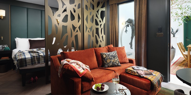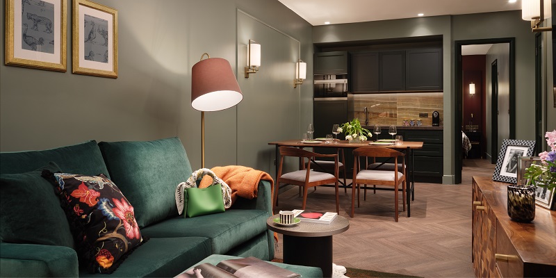 Founder of The Other House, Naomi Heaton, has worked closely with the award-winning, London-based, Bergman Design House as interior design partner. The Club Flats, located off corridors with alternating designs and colours to create a changing ‘streetscape’, are all named after famous local residents so each has its own unique ‘address’. Boldly designed eclectic spaces, they comprise a sitting room, kitchenette, bedroom and elegant shower room. They are saturated with rich colours, think teal blue, deep green and oxblood red, and layered with velvets, British tweed and bold botanical prints. Laser cut metal screens with a burnished gold and brass effect, with tree, leaf and Art-Deco designs often feature as artwork separating the bedroom and the sitting room. Shower rooms reflect the same colour scheme as the main living areas to create a sense of flow and continuity of space.