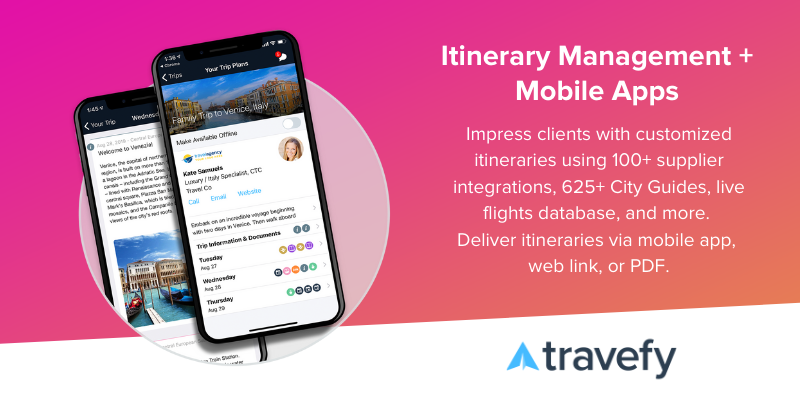 Give your business a boost and streamline for max efficiency with Travefy! The all-in-one system allows you to create eye-popping itineraries and proposals along with a simple CRM solution to keep client details organized in one place. Travefy also has a built-in forms feature that allows you to collect client information, payment information, and e-signatures. In response to the pandemic, Travefy released a streamlined website builder to help travel advisors market their business and capture more bookings.